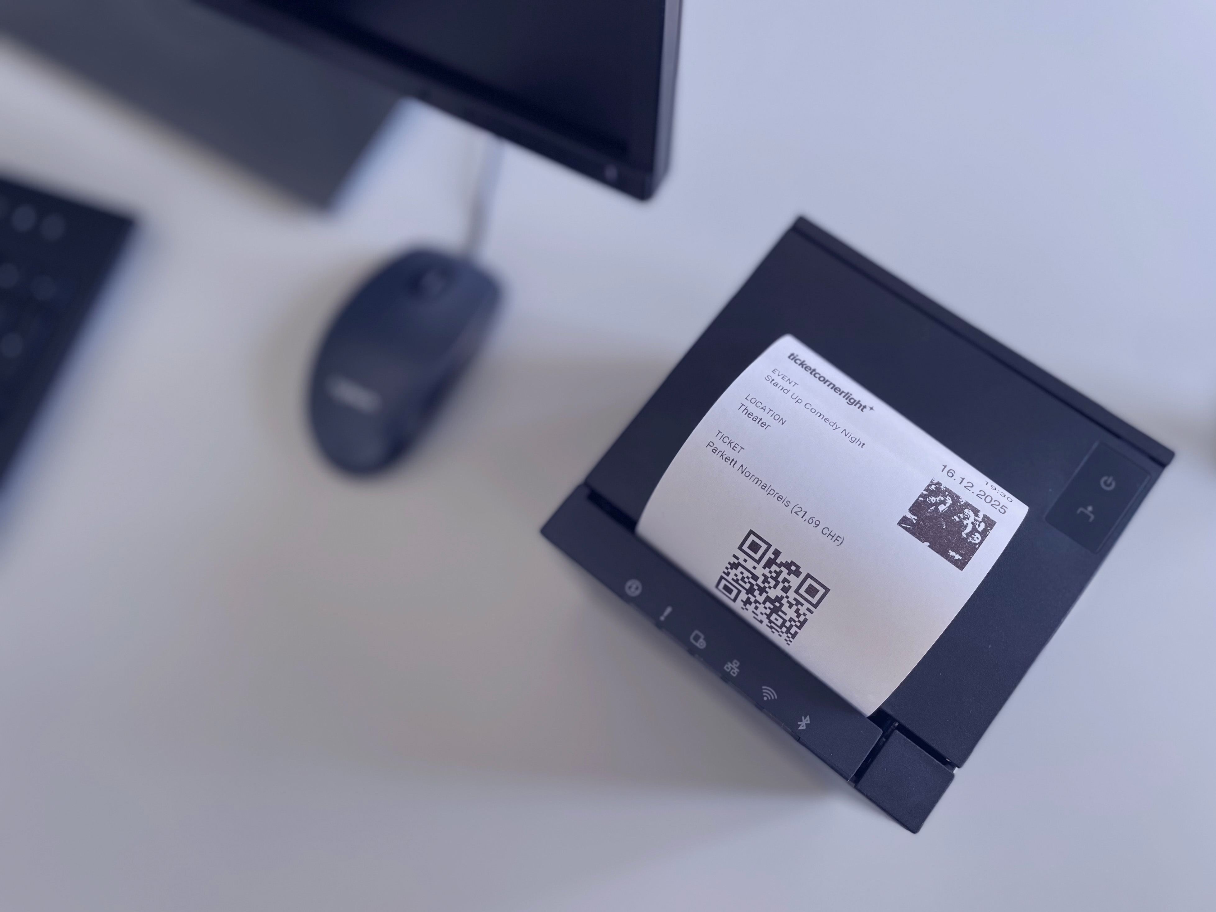 Notre module de vente directe peut facilement être connecté à une imprimante de tickets Epson standard. Une fois installé, tu peux facilement et rapidement imprimer au guichet des billets sous forme de tickets pour tes clientes et clients. Ceux-ci contiennent un code QR et peuvent être validés comme d'habitude avec l'application EVENTIM.Access Scan-App. Tu peux également imprimer le billet PDF sur une imprimante A4 standard.